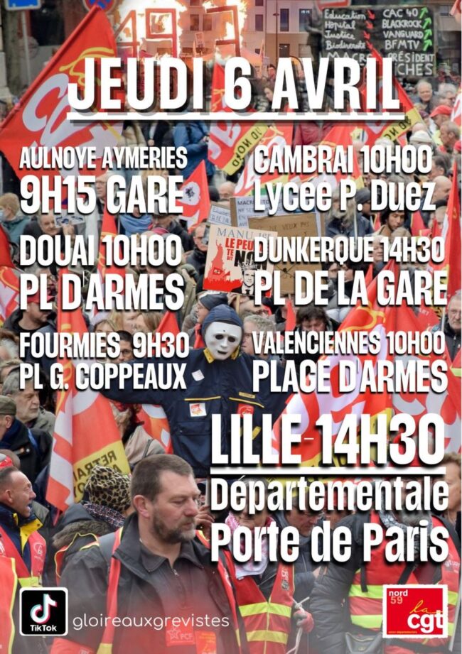RASSEMBLEMENTS ET MANIFESTATIONS DU JEUDI 23 MARS 2023 CAMBRAI 10 H GRAND PLACE DOUAI 10 H PLACE D’ARMES DUNKERQUE 14 H 30 PLACE DE LA GARE FOURMIES 10 H DEVANT L’UL CGT (Place Georges Coppeaux) MAUBEUGE 10 H POLE GARE VALENCIENNES 10 H PLACE D’ARMES ET MANIFESTATION DEPARTEMENTALE 14 H 30 Porte…