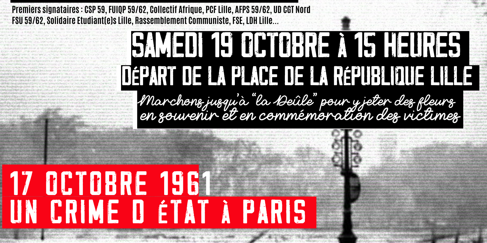 Oct182024ActualitéCommuniqués17 OCTOBRE 1961 UN CRIME D’ÉTAT À PARIS – Copie Catégories : Actualité, Communiqués18 octobre 2024 Partager cet article Partager sur FacebookPartager sur Facebook Partager sur TwitterPartager sur Twitter Partager sur LinkedInPartager sur LinkedIn Partager sur WhatsAppPartager sur WhatsApp Ces informations vous intéressent également !2 Décembre Rassemblement cour d’appel de Douai 9 h30 octobre 20256 novembre – actifs et retraités même combat 14h 30 Porte de Paris à Lille30 octobre 2025Meeting pour la nationalisation d’Arcelor 4 Novembre30 octobre 2025La CGT solidaire du peuple Palestinien20 octobre 20252 Octobre Journée de grève et Manifestations25 septembre 202518 Septembre – Journée de Grèves et Manifestation12 septembre 2025